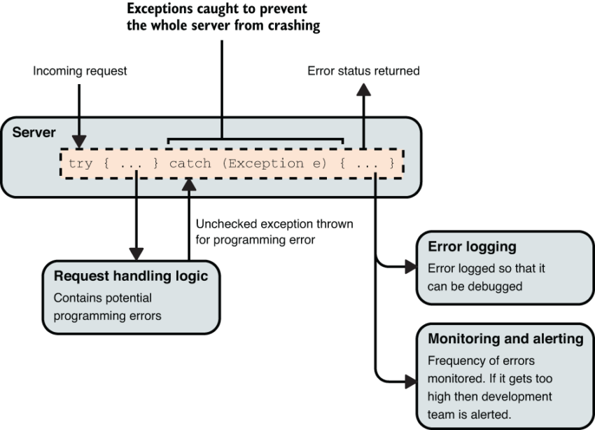 | Note | Server frameworks Most server frameworks contain features to allow you to isolate errors for individual requests and map certain types of error to different error responses and handling. It’s therefore unlikely that you’d have to write your own try–catch statement, but something conceptually similar to this will be happening inside the server framework. |