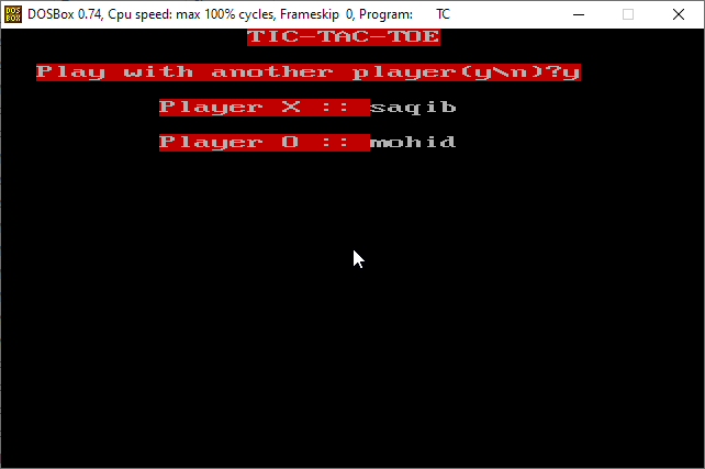 1 2 3 4 5 6 7 8 9 10 11 12 13 14 15 16 17 18 19 20 21 22 23 24 25 26 27 28 29 30 31 32 33 34 35 36 37 38 39 40 41 42 43 44 45 46 47 48 49 50 51 52 53 54 55 56 57 58 59 60 61 62 63 64 65 66 67 68 69 70 71 72 73 74 75 76 77 78 79 80 81 82 83 84 85 86 87 88 89 90 91 92 93 94 95 96 97 98 99 100 101 102 103 104 105 106 107 108 109 110 111 112 113 114 115 116 117 118 119 120 121 122 123 124 125 126 127 128 129 130 131 132 133 134 135 136 137 138 139 140 141 142 143 144 145 146 147 148 149 150 151 152 153 154 155 156 157 158 159 160 161 162 163 164 165 166 167 168 169 170 171 172 173 174 175 176 177 178 179 180 181 182 183 184 185 186 187 188 189 190 191 192 193 194 195 196 197 198 199 200 201 202 203 204 205 206 207 208 209 210 211 212 213 214 215 216 217 218 219 220 221 222 223 224 225 226 227 228 229 230 231 232 233 234 235 236 237 238 239 240 241 242 243 244 245 246 247 248 249 250 251 252 253 254 255 256 257 258 259 260 261 262 263 264 265 266 267 268 269 270 271 272 273 274 275 276 277 278 279 280 281 282 283 284 285 286 287 288 289 290 291 292 293 294 295 296 297 298 299 300 301 302 303 304 305 306 307 308 309 310 311 312 313 314 315 316 317 318 319 320 321 322 323 324 325 326 327 328 329 330 331 332 333 334 335 336 337 338 339 340 341 342 343 344 345 346 347 348 349 350 351 352 353 354 355 356 357 358 359 360 361 362 363 364 365 366 367 368 369 370 371 372 373 374 375 376 377 378 379 380 381 382 383 384 385 386 387 388 389 390 391 392 393 394 395 396 397 398 399 400 401 402 403 404 405 406 407 408 409 410 411 412 413 414 415 416 417 418 419 420 421 422 423 424 425 426 427 428 429 430 431 432 433 434 435 436 437 438 439 440 441 442 443 444 445 446 447 448 449 450 451 452 453 454 455 456 457 458 459 460 461 462 463 464 465 466 467 468 469 470 471 472 473 474 475 476 477 478 479 480 481 482 483 484 485 486 487 488 489 490 491 492 493 494 495 496 497 498 499 500 501 502 503 504 505 506 507 508 509 510 511 512 513 514 515 516 517 518 519 520 521 522 523 524 525 526 527 528 529 530 531 532 533 534 535 536 537 538 539 540 541 542 543 544 545 546 547 548 549 550 551 552 553 554 555 556 557 558 559 560 561 562 563 564 565 566 567 568 569 570 571 572 573 574 575 576 577 578 579 580 581 582 583 584 585 586 587 588 589 590 591 592 593 594 595 596 597 598 599 600 601 602 603 604 605 606 607 608 609 610 611 612 613 614 615 616 617 618 619 620 621 622 623 624 625 626 627 628 629 630 631 632 633 634 635 636 637 638 639 640 641 642 643 644 645 646 647 648 649 650 651 652 653 654 655 656 657 658 659 660 661 662 663 664 665 666 667 668 669 670 671 672 673 674 675 676 677 678 679 680 681 682 683 684 685 686 687 688 689 690 691 692 693 694 695 696 697 698 699 700 701 702 703 704 705 706 707 708 709 710 711 712 713 714 715 716 717 718 719 720 721 722 723 724 725 726 727 728 729 730 731 732 733 734 735 736 737 738 739 740 741 742 743 744 745 746 747 748 749 750 751 752 753 754 755 756 757 758 759 760 761 762 763 764 765 766 767 768 769 770 771 772 773 774 775 776 777 778 779 780 781 782 783 784 785 786 787 788 789 790 791 792 793 794 795 796 797 798 799 800 801 802 803 804 805 806 807 808 809 810 811 812 813 814 815 816 817 818 819 820 821 822 823 824 825 826 827 828 829 830 831 832 833 834 835 836 837 838 839 840 841 842 843 844 845 846 847 848 849 850 851 852 853 854 855 856 857 858 859 860 861 862 863 864 865 866 867 868 869 870 871 872 873 874 875 876 877 878 879 880 881 882 883 884 885 886 887 888 889 890 891 892 893 894 895 896 897 898 899 900 901 902 903 904 905 906 907 908 909 910 911 912 913 914 915 916 917 918 919 920 921 922 923 924 925 926 927 928 929 930 931 932 933 934 935 936 937 938 939 940 | #include <iostream.h> #include <conio.h> #include <stdlib.h> #include <dos.h> #include <math.h> #include <string.h> #include <stdio.h> #include <time.h> #define HORZ_BAR 205 #define VERT_BAR 186 #define UP_LEFT_CORNER 201 #define LO_LEFT_CORNER 200 #define UP_RIGHT_CORNER 187 #define LO_RIGHT_CORNER 188 #define MIDDLE_JOINT 206 #define RIGHT_JOINT 185 #define LEFT_JOINT 204 #define UPPER_JOINT 203 #define LOWER_JOINT 202 #define SOLID_CURSOR 219 #define FADED_CURSOR 219 #define UP 72 #define DOWN 80 #define LEFT 75 #define RIGHT 77 #define ESC 27 void drawMainWindow(void); void playMusic(void); void drawPlayBox(int, int); void drawRect(int, int, int, int); void playGame(void); void clearCursor(); void moveCursor(int); void quitGame(void); void errorTone(void); int win(int&, int&); void resetGame(void); void machineTurn(void); int curX = 7, curY = 4, globalX = 0, globalY = 0, scoreX = 0, scoreO = 0; char mark[16][16] = {' '}; enum {TURN_X = 0, TURN_O = 1}; int turn = TURN_X, playMachine = 0; int findX[] = {7, 11, 15, 19, 25, 29, 33, 37, 43, 47, 51, 55, 61, 65, 69, 73}; int findY[] = {4, 6, 8, 10, 8, 10, 12, 14, 12, 14, 16, 18, 16, 18, 20, 22}; char name[2][10]; void resetGame(void) { globalX = 0, globalY = 0; curX = 7, curY = 4; textcolor(4); textbackground(4); for(int i = 0; i < 16; i++) for(int j = 0; j < 16; j++) mark[i][j] = ' '; for(i = 7; i <= 19; i+= 4) { for(j = 4; j <= 10; j += 2) { gotoxy(i, j); cprintf(" "); } } for(i = 25; i <= 37; i += 4) { for(int j = 8; j <= 14; j += 2) { gotoxy(i, j); cprintf(" "); } } for(i = 43; i <= 55; i += 4) { for(int j = 12; j <= 18; j += 2) { gotoxy(i, j); cprintf(" "); } } for(i = 61; i <= 73; i += 4) { for(int j = 16; j <= 22; j += 2) { gotoxy(i, j); cprintf(" "); } } gotoxy(31, 21); textcolor(4); textbackground(4); cprintf(" "); textcolor(4); textbackground(4); gotoxy(25, 22); cprintf(" "); textbackground(4); textcolor(2); gotoxy(curX, curY); cprintf("%c",SOLID_CURSOR); playGame(); } void wasteTime(void) { textcolor(0); textbackground(4); gotoxy(42, 6); cprintf("Thinking!!!"); for(int i = 100; i <= 500 + (random(15) * 100); i += 100) { sound(i); delay(100); nosound(); delay(50); } nosound(); textbackground(4); gotoxy(42, 6); cprintf(" "); } void machineTurn(void) { int machineX, machineY; wasteTime(); do { machineX = random(16); machineY = random(4); if(machineX 